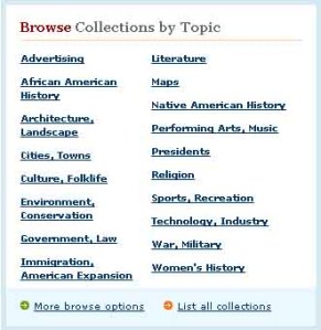 This amazing site at the Library of Congress has digitized exhibits — pictures, postcards, letters and music, and much more. Browse the collection by such topics as sports, religion, maps, and literature, to name just a few (see list graphic of collections from the LOC website).