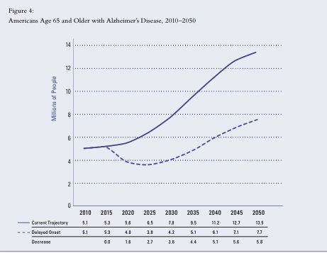 The report also projects and demonstrates, with easy-to-understand graphs, how the number of cases and the massive amounts of money required for care could be positively affected if successful treatments, or at least treatments that delay onset by some number of years, are developed. This scenario is depicted in the graph, reproduced from the study. You can read the Alzheimer’s Association press release to get an overview, but the report itself is a “must read.” All together, the many graphics in the report starkly portray our heartbreaking future, but they also provide a peek at the potential respite from treatment advances.