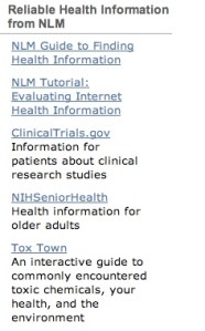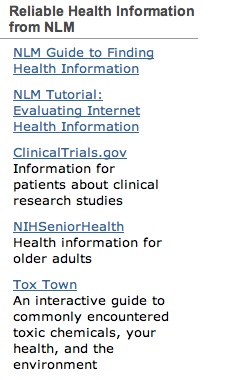 - A section titled Reliable Health Information from NLM leads to multiple health databases and safety information