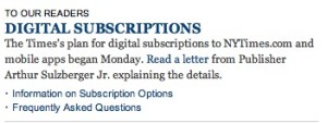 It’s been many years since we’ve had a paper edition of the New York Times delivered to our house. However, we are always reading the paper. I bet we check the digital editions every few hours during the day. During crises in the world, we may even check it late at night or first thing in the morning. Like many people who have gone digital, we view the newspaper on our computers, Blackberry, iPhone, and recently using our iPad. Moreover, for much of the past 15 years, give or take the few times when the paper has tried to tweak its access in one way or another, we’ve had free access.