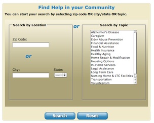 The eldercare resource and community search tool is easy to use. A user can search for resources by putting in a zip code OR a city and state (not both). If you are looking for resources on a specific topic, skip the zip code and city boxes and choose a topic on the right hand side of the search tool. Either way, click the search button. A picture of the search tool is at right.