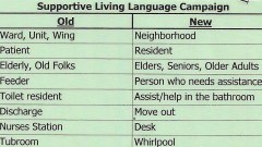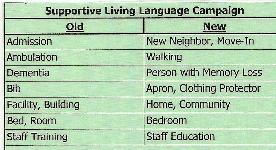 At Virginia Mennonite Retirement Community (VMRC ), where my parents live, I discovered that every staff member carries a green laminated card, covered on both sides with printed words. This wallet-size card, part of the community’s Supportive Living Language Campaign, is a mini-vocabulary review, reminding staff members that some words are more respectful than others. Inspired by the Eden Alternative organization (Read the 10 Principles that are a part of the Eden Alternative mission), the card is a VMRC campaign that aims to make a big impact by helping everyone view aging as a normal part of life. The goal is to de-emphasize words that relate to a medical mode, trivialize, or make people feel less vibrant and alive and competent.