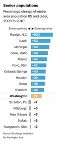 The June 28, 2011 article, by Carol Morello, features an eye-opening graph depicting, by location, the increasing numbers of over-65 residents. Most communities, the article points out, are behind in addressing the issues that result from the increasing numbers of seniors.
