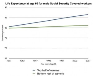 Raising the age for eligibility is inequitable, because the rich live longer and the poorer Americans need the care that Medicare provides. Heckman provides a nifty and attention-grabbing graph that depicts the differences in life expectancy for men, age 65 who are at the top half and the bottom half of wage earners .
