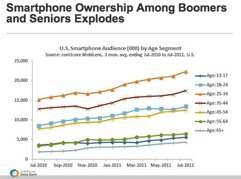 At first I thought I might just purchase a new iPhone the next morning, but then I remembered that the presumed announcement for the iPhone 5 is next week, in early October. Also, I’ve promised to give my 85-year-old mom my iPhone when I get a new one. She is really excited about this, and if you read a recent post, Smartphone Ownership Among Boomers and Seniors Explodes, over at Aging Online, you’ll understand a bit more about why mom is eager to get started with a smartphone.