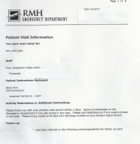One page of the discharge orders from my mom's emergency visit. Because it was not too serious, I visited a day or two later. Her fall resulted in a short hospitalization about two weeks later.