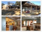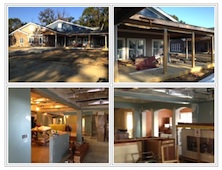 Two of the pictures are taken from the front of the buildings, showing the deep and expansive porch areas, and the other two of the inside, one in the main entryway with the kitchen along the left-hand side and the other looking toward the sunroom (arches), taken from the kitchen area.