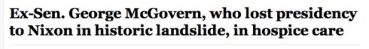 Senator McGovern in Hospice Care This entry was posted on October 16, 2012, in aging parents, Caregiving, end of life, Hospice and tagged aging parents, end of life, George McGovern, Hospice. Bookmark the permalink. Leave a comment Hospice offers so many options and opportunities to families. This Associated Press article appeared in today’s Washington Post (10-16-2012). It is worth reading. Share this: Click to email a link to a friend (Opens in new window) Email Click to share on Facebook (Opens in new window) Facebook Click to share on LinkedIn (Opens in new window) LinkedIn Click to share on Pinterest (Opens in new window) Pinterest Click to print (Opens in new window) Print More Click to share on Reddit (Opens in new window) Reddit Like Loading... Related