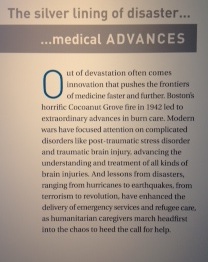 I discovered, for instance, how much physicians learn each time an influenza epidemic occurs and how, as a result of the horrific Coconut Grove nightclub fire many years ago in Boston, doctors advanced burn care. Exhibits explained how war injuries lead to more understanding about brain injuries and how doctors with patients who experience great pain often seek innovative ways to help lessen the agony.